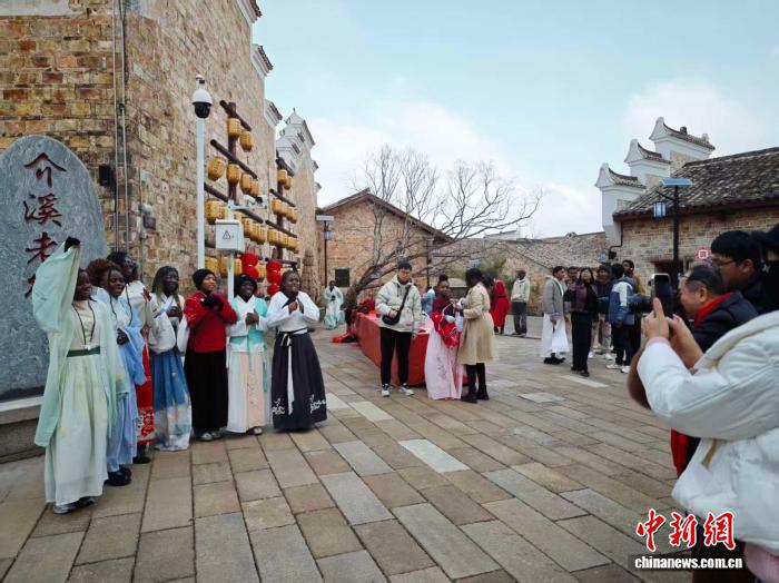 “真是太巧合了,原来马年是我的本命年!”来自南苏丹的留学生伊丽莎白今年24岁,热爱中国传统文化的她,对生肖属相非常感兴趣。“我需要买一顶红帽子庆祝新年。” 2月7日,来自江西工程学院、新余学院的70多名留学生来到江西省新余市分宜县介桥村,身穿汉服品尝糍粑等传统美食,体验剪纸、写春联等习俗,感受古村传统建筑之美。