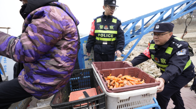 民警维护渡口秩序。摄影 | 江西日报全媒体记者 尹晓军 7分钟,年过六旬船老大王的跃驾驶的渡轮就横渡长江,从安徽宿松到了江西彭泽。2万步,年近六旬的民警梅玉胜不到半天,就走了这么多路。 2月10日11时许,在彭泽县狄公楼长江码头,随着一波客流的到来,两个老熟人又相见了。“老王,情况怎么样?”“有你们保驾护航,一切顺利!” 几乎每天,两人都要见面。临近春节,身为彭泽县公安局水上派出所所长的梅玉胜,对这艘连接两省的渡轮格外关注:“维护好码头和船上的秩序,对保障航行安全至关重要,不能有丝毫马虎。” 11时20分,伴随着汽笛声,渡轮开始上客,等待的人群或挑起担子,或推着三轮车、骑着摩托车向船上涌去。 “慢点慢点,大家不要挤,注意安全。”“老陈,你们搭把手,帮这个老人家推一下车,维持一下秩序。”梅玉胜一边推着车,一边叮嘱一旁的志警陈荣世。人群中,身穿反光背心的他们显得格外醒目。 这艘渡轮,连接着宿松县套口村和彭泽县城。乘客大多是套口村的菜农,每天一大早带着各种蔬菜前往彭泽县城售卖,又带着采购的生活用品返回。 “村里离宿松县城好几十公里,我们更愿意到一江之隔的彭泽县城来卖菜、买东西,坐船一下子就过来了,很方便。每天民警梅玉胜他们都会在渡口,经常上船来帮忙,让我们能平安便捷过江。”面对记者采访,船上的乘客都笑着要给梅玉胜“一万个点赞”。