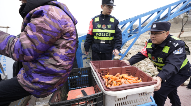民警维护渡口秩序。摄影 | 江西日报全媒体记者 尹晓军 7分钟,年过六旬船老大王的跃驾驶的渡轮就横渡长江,从安徽宿松到了江西彭泽。2万步,年近六旬的民警梅玉胜不到半天,就走了这么多路。 2月10日11时许,在彭泽县狄公楼长江码头,随着一波客流的到来,两个老熟人又相见了。“老王,情况怎么样?”“有你们保驾护航,一切顺利!” 几乎每天,两人都要见面。临近春节,身为彭泽县公安局水上派出所所长的梅玉胜,对这艘连接两省的渡轮格外关注:“维护好码头和船上的秩序,对保障航行安全至关重要,不能有丝毫马虎。” 11时20分,伴随着汽笛声,渡轮开始上客,等待的人群或挑起担子,或推着三轮车、骑着摩托车向船上涌去。 “慢点慢点,大家不要挤,注意安全。”“老陈,你们搭把手,帮这个老人家推一下车,维持一下秩序。”梅玉胜一边推着车,一边叮嘱一旁的志警陈荣世。人群中,身穿反光背心的他们显得格外醒目。 这艘渡轮,连接着宿松县套口村和彭泽县城。乘客大多是套口村的菜农,每天一大早带着各种蔬菜前往彭泽县城售卖,又带着采购的生活用品返回。 “村里离宿松县城好几十公里,我们更愿意到一江之隔的彭泽县城来卖菜、买东西,坐船一下子就过来了,很方便。每天民警梅玉胜他们都会在渡口,经常上船来帮忙,让我们能平安便捷过江。”面对记者采访,船上的乘客都笑着要给梅玉胜“一万个点赞”。