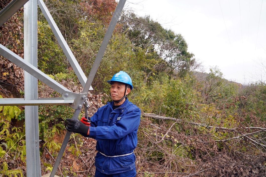 年关将至,赣鄱大地年味渐浓。当人们准备围炉守岁、期盼新春之际,武夷山麓的贵溪市冷水镇,崇山峻岭间依旧穿行着一个执着的身影:群众护线员吴初根踏霜而行,以20多年的坚守,默默守护着贯通山林、连接工矿企业的电力“动脉”。 数九寒天,武夷山脉的晨雾中裹着霜寒,让人更觉寒冷。天刚蒙蒙亮,吴初根家里已经亮起灯,他麻利地刷牙洗脸、检查上山要用的物品,匆匆吃过早饭后便准备出门。妻子朱样琴赶忙追出来,把热乎的馒头塞进他的包里,一边叮嘱道:“天寒地冻,路上滑,这些记得吃啊。” 山上的路不好走,老吴常备着柴刀,用来清理杂乱的树木,为自己开出一条山路。攀爬半个多小时后,他抵达第一基杆塔——“白云线137号杆”。他仔细检查塔基一周,重点查看杆塔拉线、接地装置是否牢固,塔材有无盗损,导线上有无鸟巢等隐患。接着,他又用力踩踏地面测试塔基状况,并清理通道内的杂物。确认一切正常后,他记录、拍照上传,随即赶往下一基杆塔。