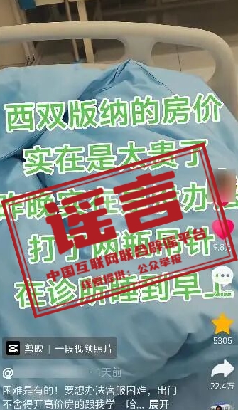 真相:近日,有网民为博人眼球、吸引流量,未具体了解事件情况,从网上随意下载火灾视频,并配文称:“五台山着火了,幸亏跑得快”。经核查,2月21日下午,五台山景区确实发生一起火情。起火地点位于台怀镇杨柏峪村,距景区核心区约2公里。火情发生在下午,当日17时左右,明火已经被扑灭,未造成人员伤亡。视频中的着火情形为夜间,属于虚假信息。目前,公安机关已对引发火情人员史某某作出行政拘留的处罚。(来源:“山西网络举报”微信公众号) 谣言三:西双版纳酒店太贵遂去诊所输液过夜