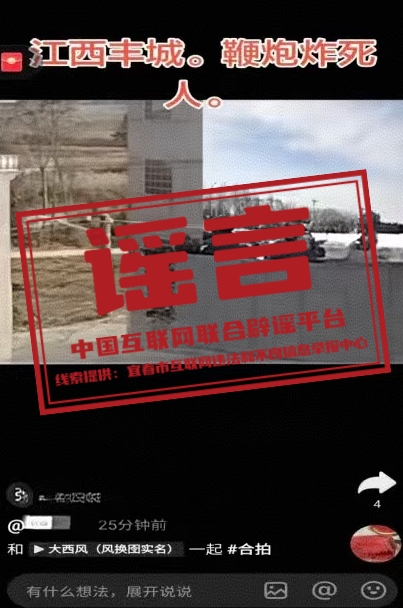 真相:2月20日,有网民发布视频称,“因云南西双版纳酒店太贵,在诊所输液过夜”。视频中还附有给诊所的付款截图。该视频引发关注,两天时间获近10万点赞,20余万次转发。经查,此事纯属谣言。实为视频发布者在视频发布的20日早上去诊所就医,谎称在诊所过夜是为了流量。诊所工作人员称,不可能让病人留宿,已向当地派出所报警。目前,该视频已删。(来源:极目新闻) 谣言四: 江西丰城鞭炮炸死人