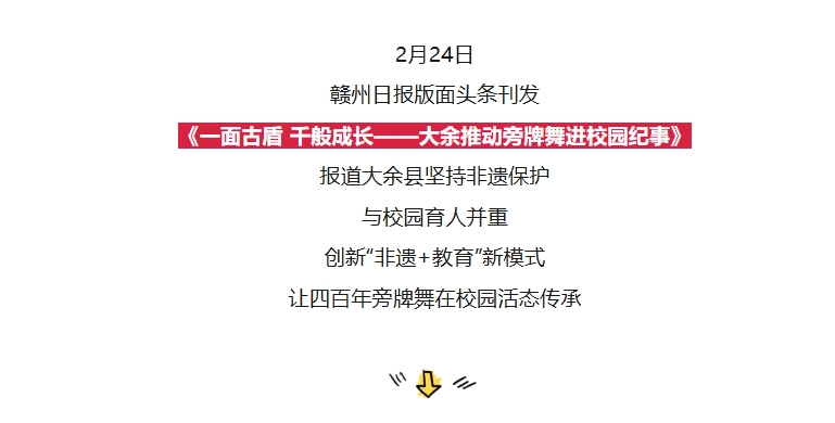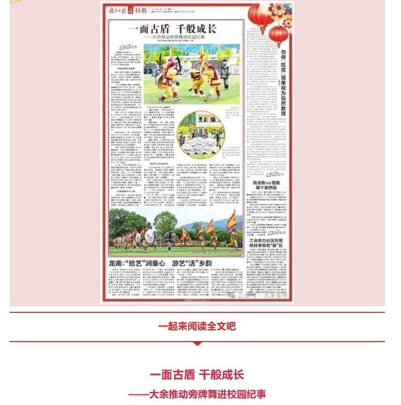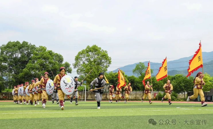 学生在演练旁牌舞铜墙铁壁阵,步兵在前面搭建铜墙铁壁、旗手在后面增强气势。 十余年来,该校累计已有1800余名学生在这门古老技艺中淬炼筋骨、安顿精神。他们的身影,从校园操场舞到了全县“双减”成果展舞台、大余春晚现场、央视《选对健康》栏目荧屏上,并在省、市级赛事与展演中屡获佳绩。但比任何奖牌更珍贵的,是生命本身的成长与挺拔。 “舞台上收获的掌声,所带来的文化认同、集体荣誉与坚持的毅力,是任何刻板说教都无法赋予的。”李君辉感慨道。一面面古朴的盾牌,默默见证了少年们完成“强体、凝心、铸魂”的完整旅程。 如今,非遗在校园扎根,早已超越了对一门技艺的挽救。它更深刻地塑造着一群健全、自信、心怀家国的少年。这朵绽放于文化沃土之上的“育人之花”,因扎根深远,故生生不息,恒久芬芳。 非遗沃土育新苗 英姿少年舞盾牌 今日之大余 诚邀您见证四百年盾牌技艺 如何在青春校园里承古开今 淬炼出文化传承的 时代锋芒 |