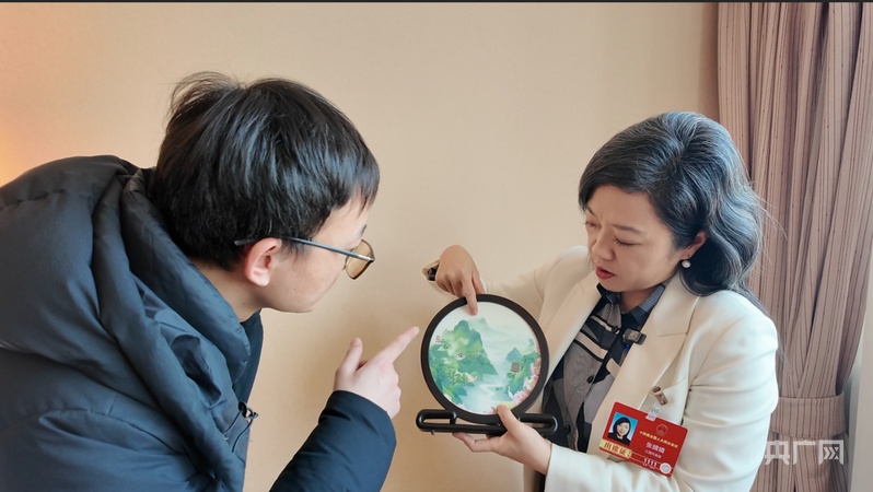 全国人大代表张婧婧向记者介绍“大美江西”数字陶瓷山水画(央广网记者 郇康新 摄) “大美江西”陶瓷山水画上,细腻的色彩渐变与层次纹理,很难让人想到这并非手绘而成。“画面通过电脑AI直接打印在陶瓷上,但要精准呈现设计,核心是破解陶瓷与科技结合的关键难题。”张婧婧解释道,陶瓷颜料通过高温烧制,前后色彩变化极大,如何让数字设计与高温烧制后的效果完美契合,成为技术攻关的核心。 这正是她近年来探索的方向,用数字技术辅助当代陶瓷设计。“如果纯手绘,这样复杂的山水画面可能需要两三天才能完成,而通过AI生成底稿、数字喷绘技术应用,不仅能快速实现设计落地,还能精准把控细节。”张婧婧表示,这并非对传统的颠覆,而是一次有益尝试。
