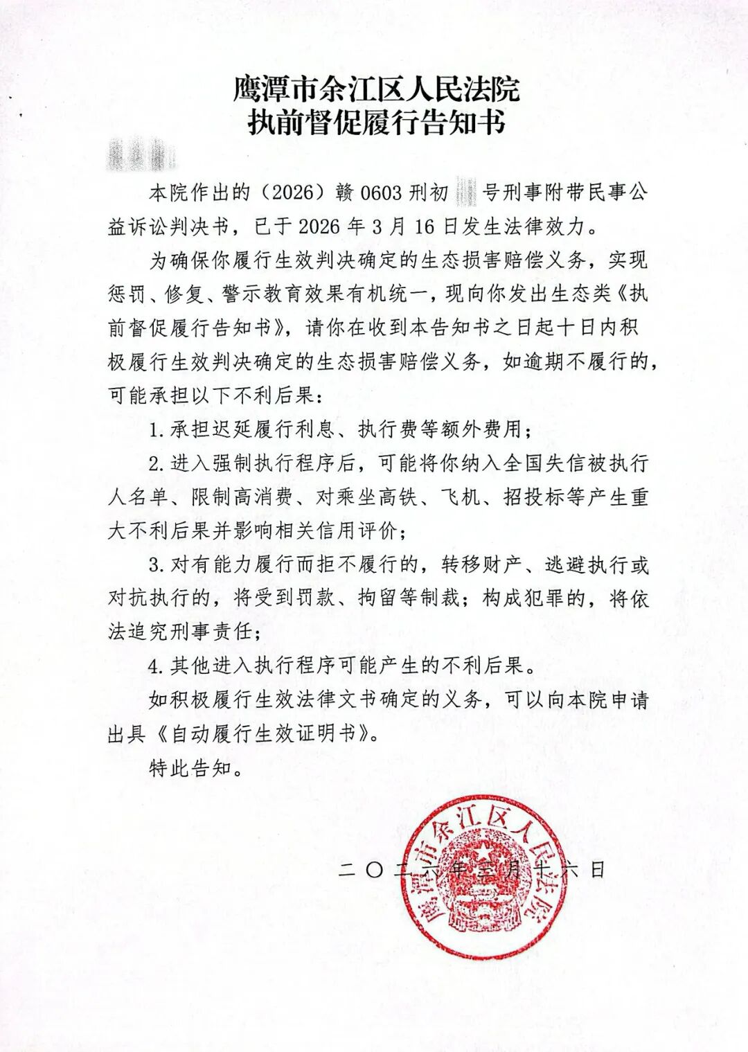 为深入贯彻习近平生态文明思想,践行“用最严格制度最严密法治保护生态环境”的要求,切实以法治保障生态环境公共利益及时修复,近日,余江区法院对不履行生态修复义务人发出全省首份生态类《执前督促履行告知书》。 2025年11月上旬,吴某为防止鸟类及动物啄食农作物,在某养猪场附近的菜地里架设了粘网及捕猎夹。至案发,吴某架设的粘网粘捕了数只鸟类及野生动物。公诉机关以吴某涉嫌非法狩猎罪向法院提起公诉及附带民事公益诉讼。余江区法院经审理认为吴某违反狩猎法规,在禁猎区及禁猎期内使用禁用的捕猎工具进行非法狩猎,破坏野生动物资源,情节严重,其行为构成非法狩猎罪,判决吴某赔偿国家野生动物资源损失计人民币26300元。 判决后,为督促当事人及时履行生态修复义务,该院紧扣生态环境保护“损害担责、生态修复”的原则,主动延伸司法职能,在执行立案前,向吴某发出告知书,明确告知其履行生态修复义务的法定依据、具体内容、履行期限,以及拒不履行的法律后果。