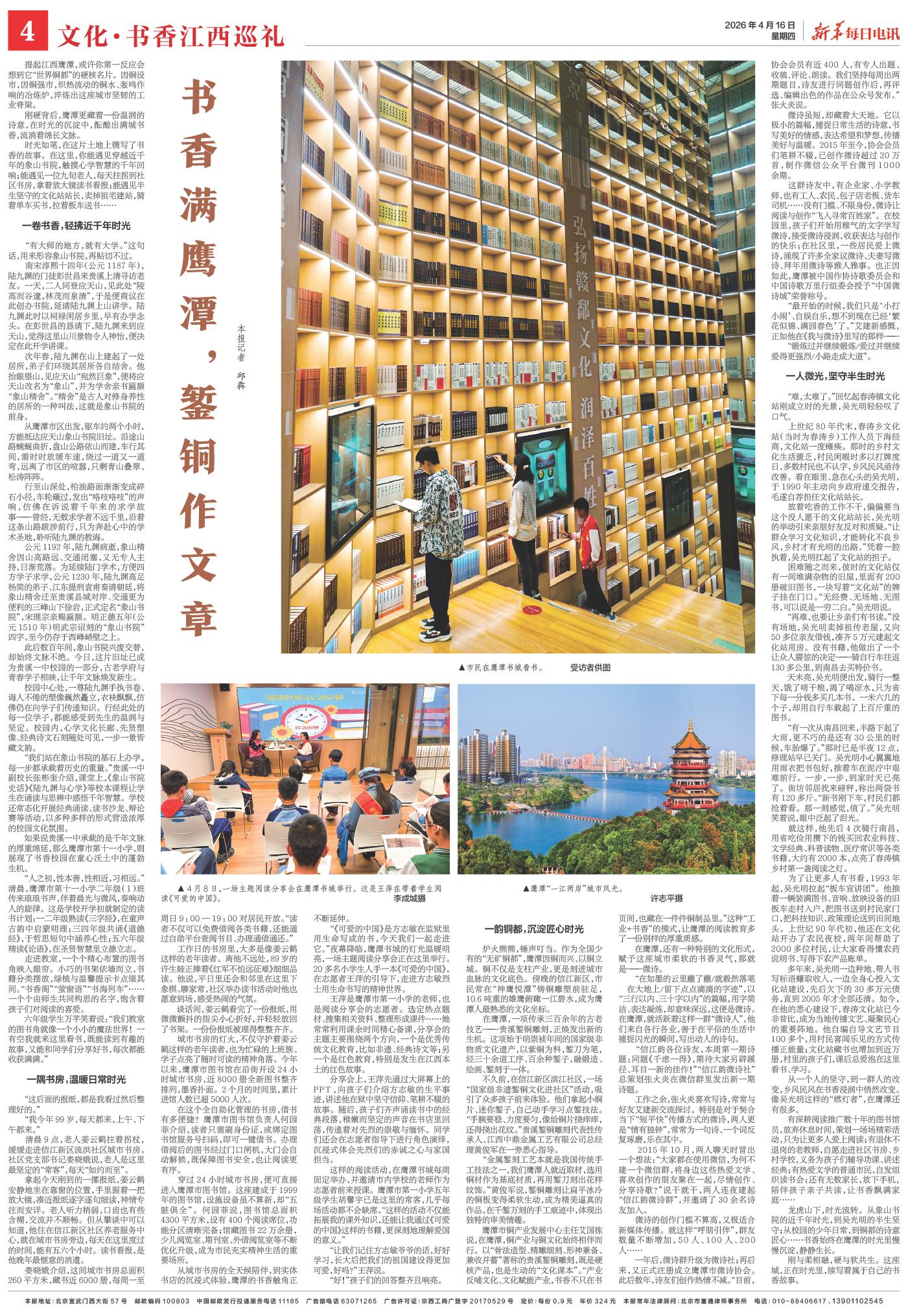 提起江西鹰潭,或许你第一反应会想到它“世界铜都”的硬核名片。因铜设市,因铜强市,炽热流动的铜水、轰鸣作响的冶炼炉,淬炼出这座城市坚韧的工业脊梁。 刚硬背后,鹰潭更藏着一份温润的诗意,在时光的沉淀中,酝酿出满城书香,流淌着绵长文脉。 时光如笔,在这片土地上镌写了书香的故事。在这里,你能遇见穿越近千年的象山书院,触摸心学智慧的千年回响;能遇见一位九旬老人,每天拄拐到社区书房,拿着放大镜读书看报;能遇见半生坚守的文化站站长,卖掉祖宅建站,骑着单车买书,拉着板车送书…… 一卷书香,轻拂近千年时光 “有大师的地方,就有大学。”这句话,用来形容象山书院,再贴切不过。 南宋淳熙十四年(公元1187年),陆九渊的门徒彭世昌来贵溪上清寻访老友。一天,二人同登应天山,见此处“陵高而谷邃,林茂而泉清”,于是便商议在此创办书院,延请陆九渊上山讲学。陆九渊此时以祠禄闲居乡里,早有办学念头。在彭世昌的恳请下,陆九渊来到应天山,觉得这里山川景物令人神怡,便决定在此开学讲课。 次年春,陆九渊在山上建起了一处居所,弟子们环绕其居所各自结舍。他抬眼望山,见应天山“宛然巨象”,便将应天山改名为“象山”,并为学舍亲书匾额“象山精舍”。“精舍”是古人对修身养性的居所的一种叫法,这就是象山书院的前身。 从鹰潭市区出发,驱车约两个小时,方能抵达应天山象山书院旧址。沿途山路蜿蜒曲折,盘山公路依山而建,车行其间,需时时放缓车速,绕过一道又一道弯,远离了市区的喧嚣,只剩青山叠翠、松涛阵阵。 行至山深处,柏油路面渐渐变成碎石小径,车轮碾过,发出“咯吱咯吱”的声响,仿佛在诉说着千年来的求学故事——曾经,无数求学者不远千里,沿着这条山路跋涉前行,只为奔赴心中的学术圣地,聆听陆九渊的教诲。 公元1192年,陆九渊病逝,象山精舍因山高路远、交通闭塞,又无专人主持,日渐荒落。为延续陆门学术,方便四方学子求学,公元1230年,陆九渊高足杨简的弟子、江东提刑袁甫奏请朝廷,将象山精舍迁至贵溪县城对岸、交通更为便利的三峰山下徐岩,正式定名“象山书院”,宋理宗亲赐匾额。明正德五年(公元1510年)明武宗诏刻的“象山书院”四字,至今仍存于西峰峭壁之上。 此后数百年间,象山书院兴废交替,却始终文脉不绝。今日,这片旧址已成为贵溪一中校园的一部分,古老学府与青春学子相映,让千年文脉焕发新生。 校园中心处,一尊陆九渊手执书卷、诲人不倦的塑像巍然矗立,衣袂飘飘,仿佛仍在向学子们传递知识。行经此处的每一位学子,都能感受到先生的温润与坚定。校园内,心学文化长廊、先贤塑像、经典诗文石刻随处可见,一步一景皆藏文韵。 “我们站在象山书院的基石上办学,每一步都承载着历史的重量。”贵溪一中副校长张彬奎介绍,课堂上,《象山书院史话》《陆九渊与心学》等校本课程让学生在诵读与思辨中感悟千年智慧。学校还常态化开展经典诵读、读书沙龙、辩论赛等活动,以多种多样的形式营造浓厚的校园文化氛围。 如果说贵溪一中承载的是千年文脉的厚重绵延,那么鹰潭市第十一小学,则展现了书香校园在童心沃土中的蓬勃生机。 “人之初,性本善,性相近,习相远。”清晨,鹰潭市第十一小学二年级(1)班传来琅琅书声,伴着晨光与微风,奏响动人的旋律。这是学校开学初就制定的读书计划:一二年级熟读《三字经》,在童声古韵中启蒙明理;三四年级共诵《道德经》,于哲思短句中涵养心性;五六年级精读《论语》,在圣贤智慧里立德立志。 走进教室,一个个精心布置的图书角映入眼帘。小巧的书架依墙而立,书籍分类摆放,绿植与温馨提示卡点缀其间。“书香阁”“萤窗语”“书海列车”……一个个由师生共同构思的名字,饱含着孩子们对阅读的喜爱。 六年级学生万芊笑着说:“我们教室的图书角就像一个小小的魔法世界!一有空我就来这里看书,既能读到有趣的故事,又能和同学们分享好书,每次都能收获满满。” 一隅书房,温暖日常时光 “这后面的报纸,都是我看过然后整理好的。” “我今年99岁,每天都来,上午、下午都来。” 清晨9点,老人姜云鹤拄着拐杖,缓缓走进信江新区流洪社区城市书房。社区党支部书记娄晓娥说,老人是这里最坚定的“常客”,每天“如约而至”。 拿起今天刚到的一摞报纸,姜云鹤安静地坐在靠窗的位置,手里握着一把放大镜,凑近报纸逐字逐句细读,神情专注而安详。老人听力稍弱,口齿也有些含糊,交流并不顺畅。但从攀谈中可以知道,他住在信江新区社区养老服务中心,就在城市书房旁边,每天在这里度过的时间,能有五六个小时。读书看报,是他晚年最惬意的消遣。 娄晓娥介绍,这间城市书房总面积260平方米,藏书近6000册,每周一至周日9:00—19:00对居民开放。“读者不仅可以免费借阅各类书籍,还能通过自助平台查阅书目、办理通借通还。” 工作日的书房里,大多是像姜云鹤这样的老年读者。离他不远处,89岁的许生睦正捧着《红军不怕远征难》细细品读。他说,平日里还会和邻里在这里下象棋、聊家常,社区举办读书活动时他也愿意到场,感受热闹的气氛。 谈话间,姜云鹤看完了一份报纸,用微微颤抖的指尖小心折好,并轻轻放回了书架。一份份报纸被理得整整齐齐。 城市书房的灯火,不仅守护着姜云鹤这样的老年读者,也为忙碌的上班族、学子点亮了随时