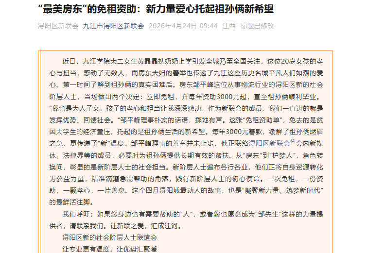 ▲4月21日南城县慰问组来到黄晶晶租住的房子(南城县融媒体中心提供) “一开始很震惊,因为我只是做了自己该做的事。他们大老远专门跑来九江,把我们这点家事放在心上,我和奶奶都很感动。”黄晶晶留下了医生的联系方式,方便日后随时为奶奶寻求专业帮助。“医生告诉我,以后用药可以联系他们,他们会开好药寄过来,医疗方面有什么问题都能问他。” 房东代文明、邹平峰夫妇,起初因为主动减免房租,被网友称作“好房东”。更让人暖心的是,最近夫妇俩不仅把房租全免了,还上门给黄晶晶送来3000元资助金。 “之前不知道她家情况这么特殊,这孩子真是懂事、坚强、能吃苦。”代文明的孩子和黄晶晶差不多大,想到自家孩子在外求学也可能需要别人帮一把,她便和丈夫商量,决定尽一份力。“免房租是我的决定,每学期资助3000元是我丈夫的主意,我也很支持。” 邹平峰所在的九江市浔阳区新联会,4月24日也发出号召,希望更多会员一起帮助黄晶晶,并计划联络会内新媒体、法律等领域的成员,必要时为祖孙俩提供长期有效的帮扶。